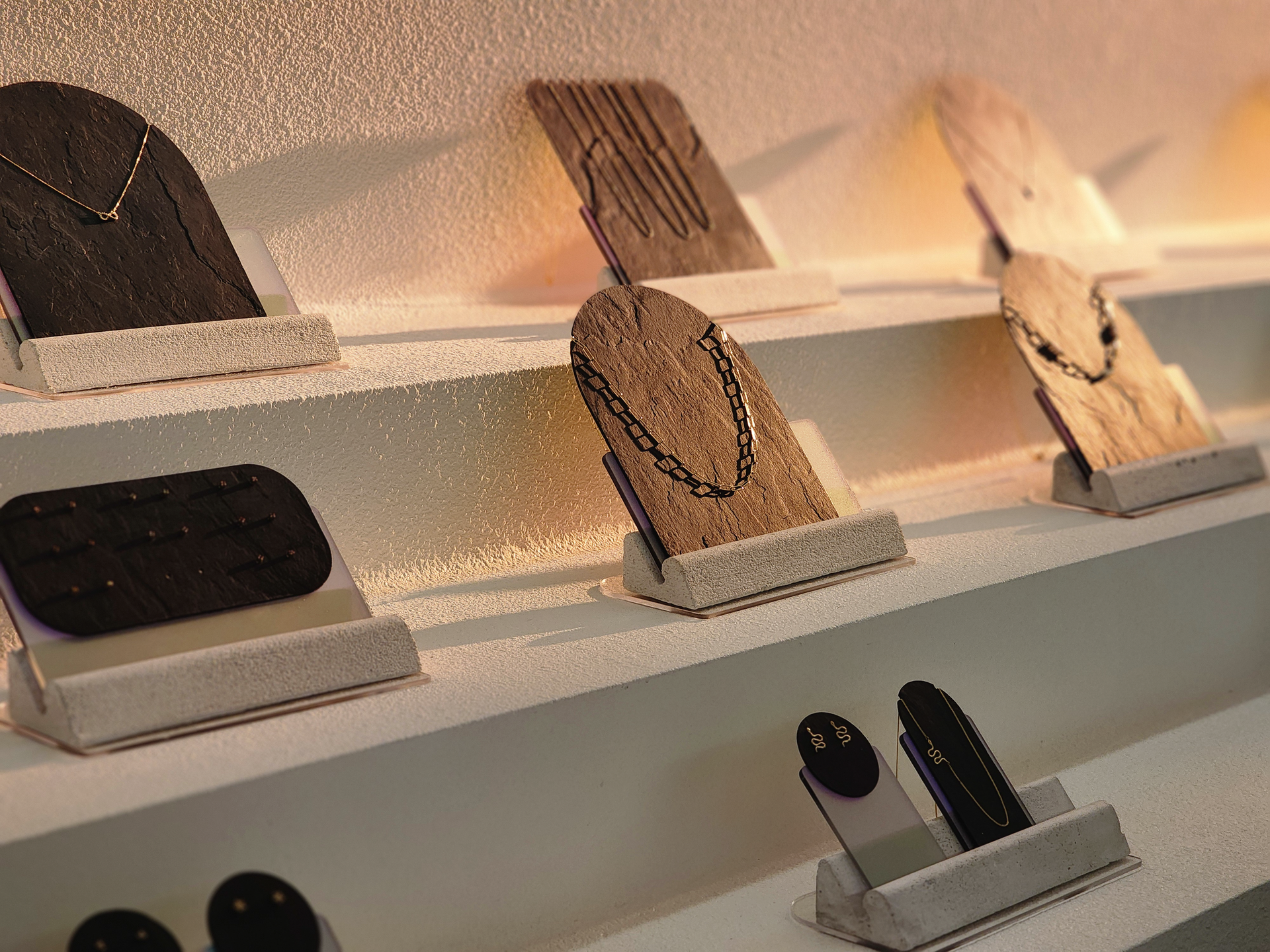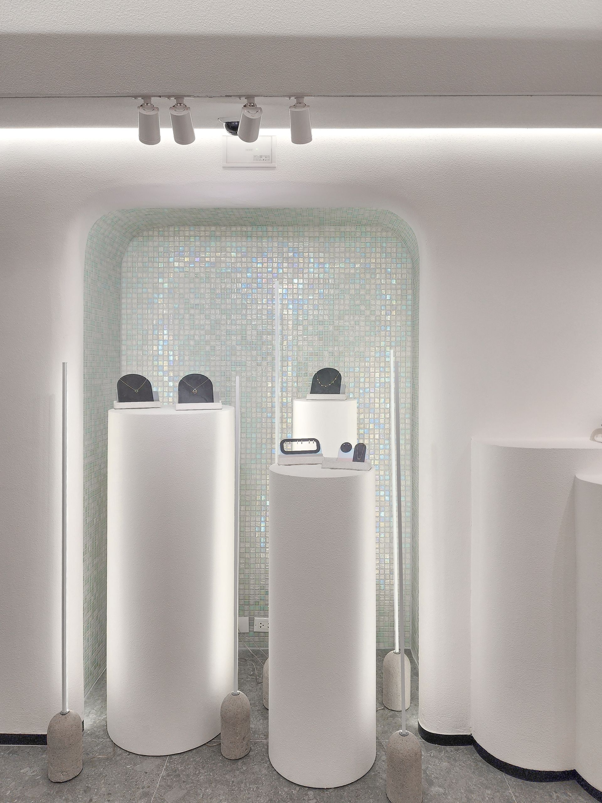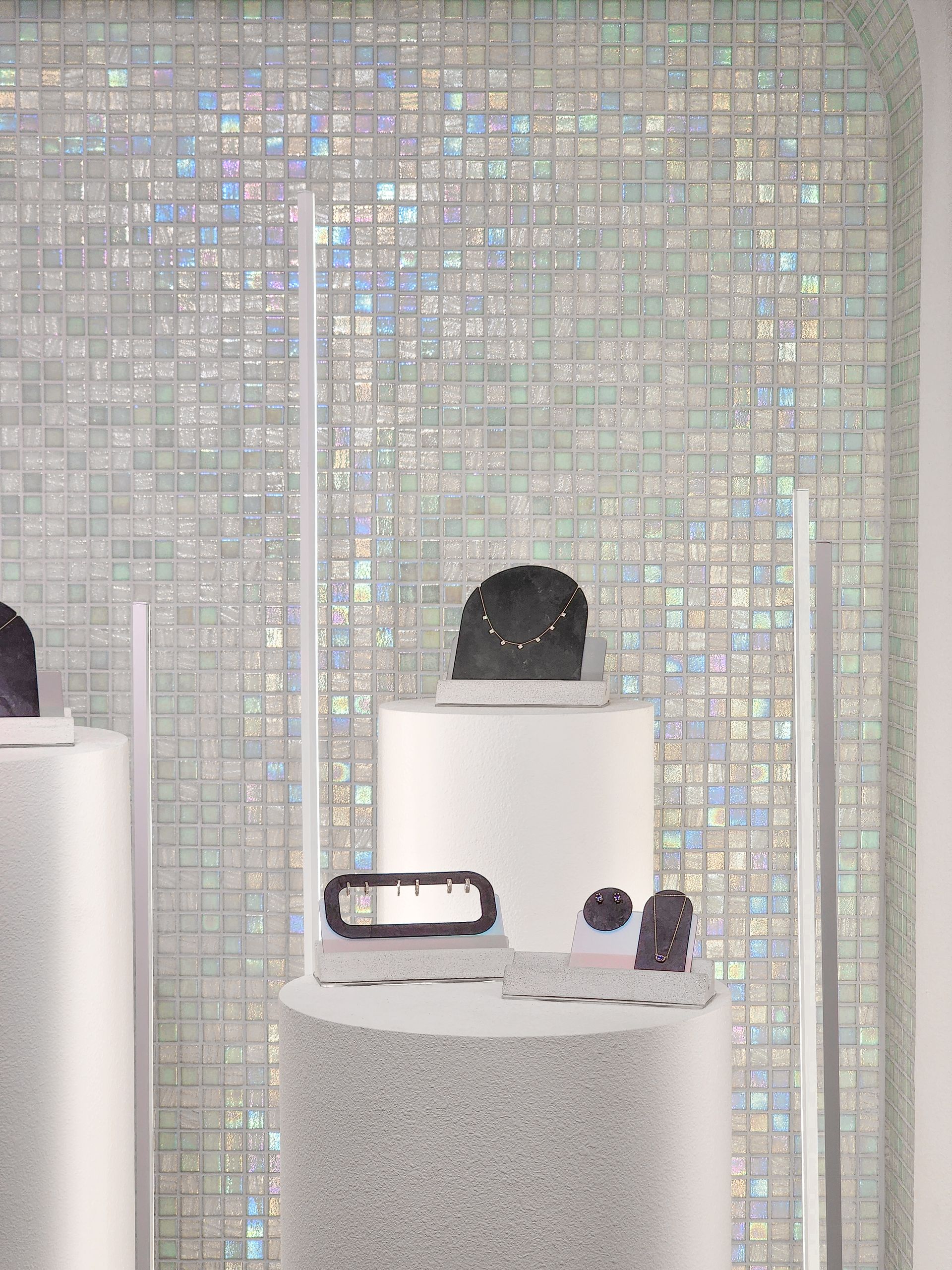 Otro elemento central son los exhibidores diseñados específicamente para este proyecto, que combinan materiales únicos como acrílicos iridiscentes, placas de piedra natural, y mezclas de concreto y yeso. Estas piezas no solo enmarcan las joyas con sofisticación, sino que también reflejan un enfoque artístico y funcional.