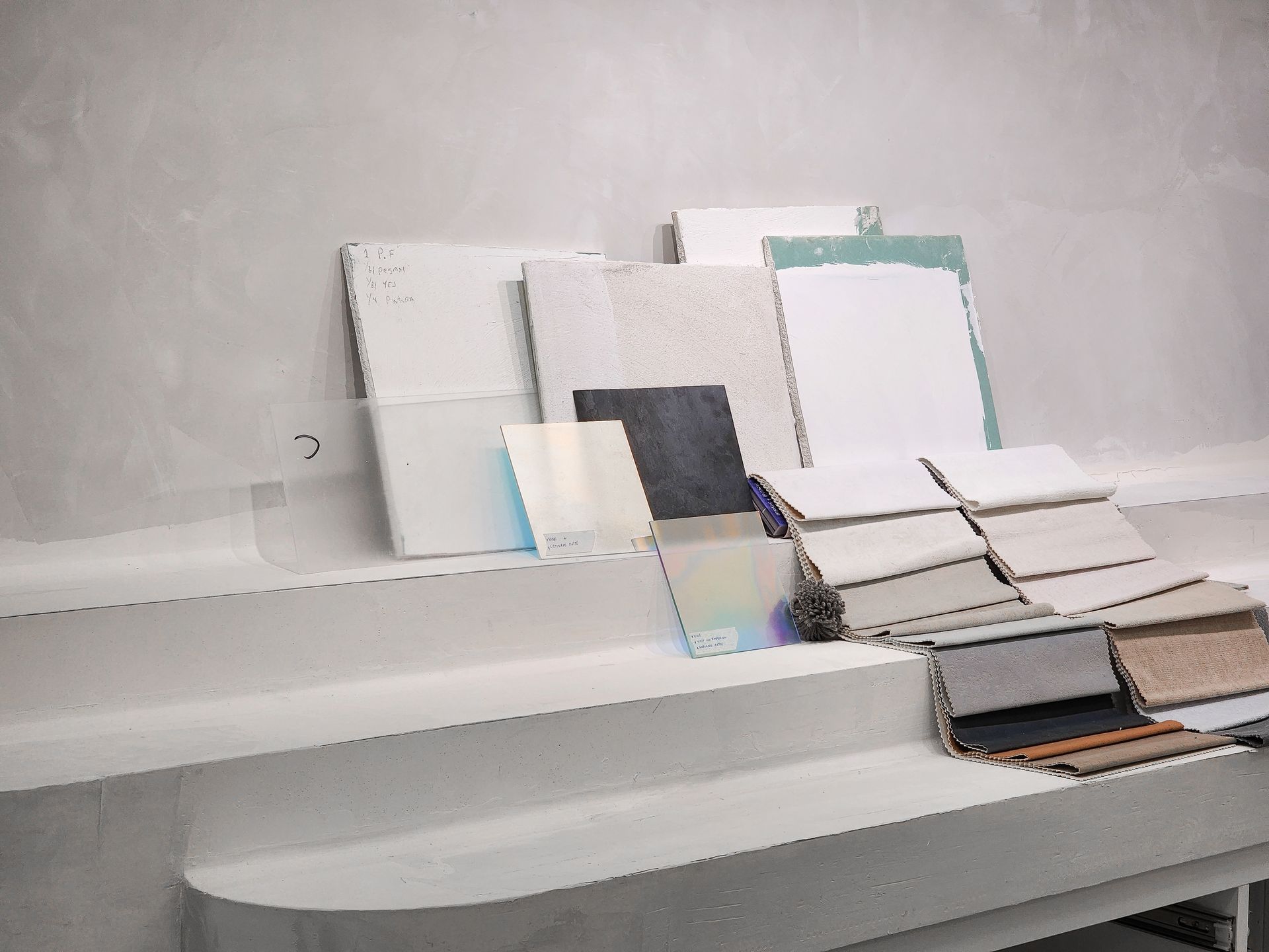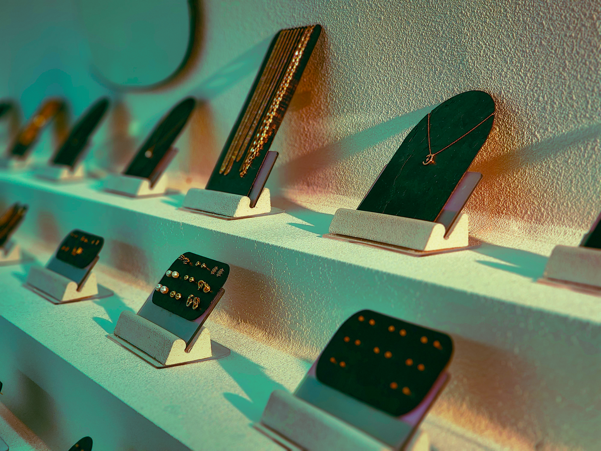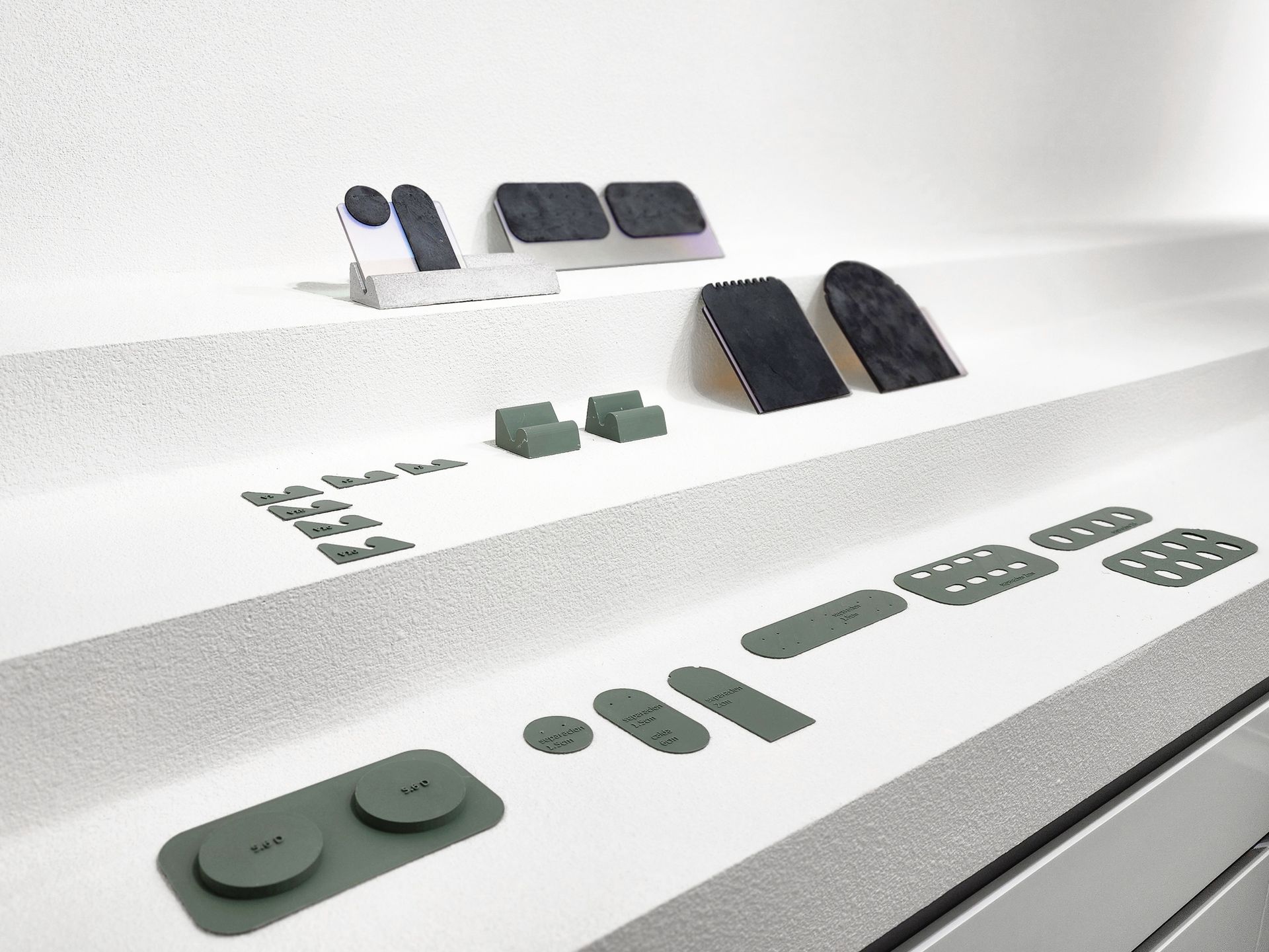 Otro elemento central son los exhibidores diseñados específicamente para este proyecto, que combinan materiales únicos como acrílicos iridiscentes, placas de piedra natural, y mezclas de concreto y yeso. Estas piezas no solo enmarcan las joyas con sofisticación, sino que también reflejan un enfoque artístico y funcional.