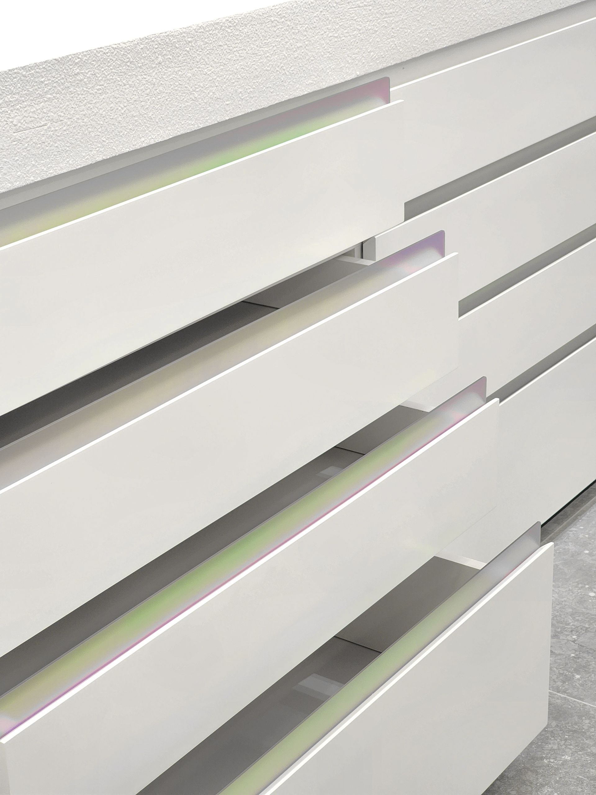 En el corazón del salón de ventas, el circuito definido por un mueble escalonado en tres niveles guía al cliente en un recorrido pensado para que cada joya se contemple en su máxima expresión. Este diseño, integrado a las paredes y con terminaciones suaves, organiza el flujo del espacio mientras preserva su armonía visual. La vitrina principal se erige como una pieza central en el salón, revestida con pepelmas iridiscentes que capturan y reflejan la luz, creando un efecto de brillo y movimiento que evoca la misma esencia de las joyas exhibidas. Este elemento no solo aporta dinamismo al diseño, sino que también refuerza la atmósfera de exclusividad que caracteriza a Aremar.