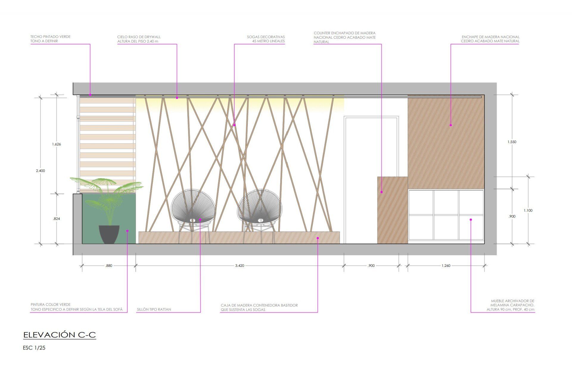 La elección de los colores, en su mayoría tonos neutros con destellos de verdes profundos, refuerza la idea de serenidad y conexión con la naturaleza. Los detalles en los acabados y las texturas juegan con la luz, creando un ambiente que parece fluctuar entre sombra y luminosidad, similar a los valles andinos durante el atardecer.